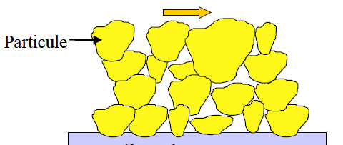L’abrasion un phénomène qui intervient par déplacement et/ou enlèvement de matière par des particules (granulats par exemple) sous l’action d’une surface fixe (toile). Une partie de la surface la plus dure raye la surface la plus tendre.