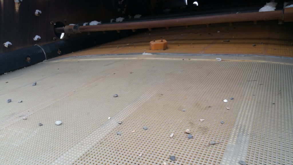 Une autre solution pour réduire le goujonnage serait de diminuer la dureté de la surface criblante. La couche polyuréthane étant plus tendre et souple, elle aura tendance à se déformer plus facilement au passage du matériau, et donc de laisser passer plus facilement le produit au travers de la maille.