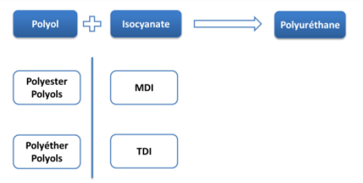 Le polyuréthane (fonction uréthane) est le résultat de la réaction chimique d’un isocyanate et d’un polyol.